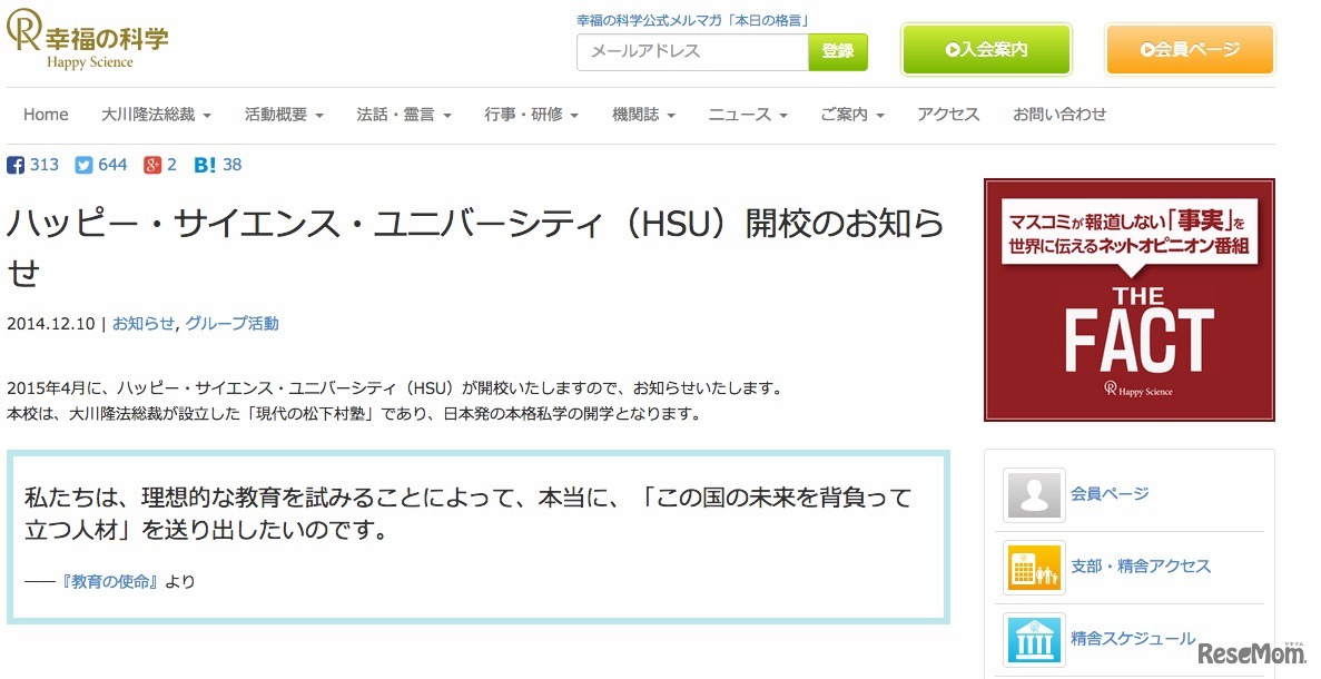 幸福の科学は、2015年4月にハッピー・サイエンス・ユニバーシティ(HSU)を開校すると発表した。文部科学省はHSUについて、2014年10月に大学教育を提供できるものとは認められないという理由で設置判定を「不可」としていた。