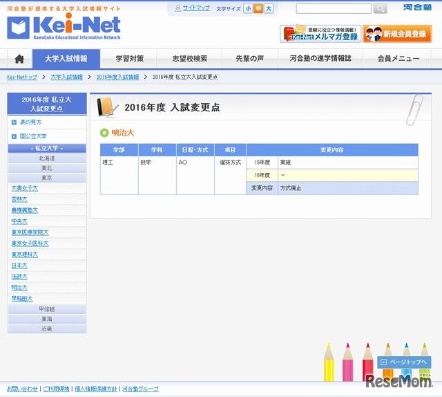 河合塾は12月18日、2016年度入試変更点一覧の最新情報を同塾の入試情報サイト「Kei-Net」に掲載した。国公立49大学と私立21大学の計70大学の入試変更点をまとめている。明治大学は理工学部数学科でAO入試を廃止する。