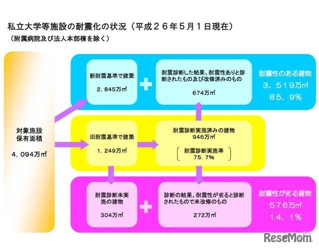 文部科学省は12月24日 平成26年度私立学校施設の耐震改修状況などの調査結果について発表。幼稚園から高校の80%、大学や短大などの85%が耐震化されており、耐震診断実施率とともに、前年度より増加していることがわかった。