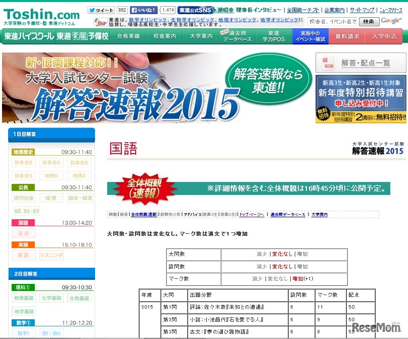 東進ドットコムは、2015年度センター試験問題のうち14時20分に終了した国語の全体概観速報と、午前に終了している地理歴史・公民科目の新高2・3年生向けアドバイス公開を開始した。