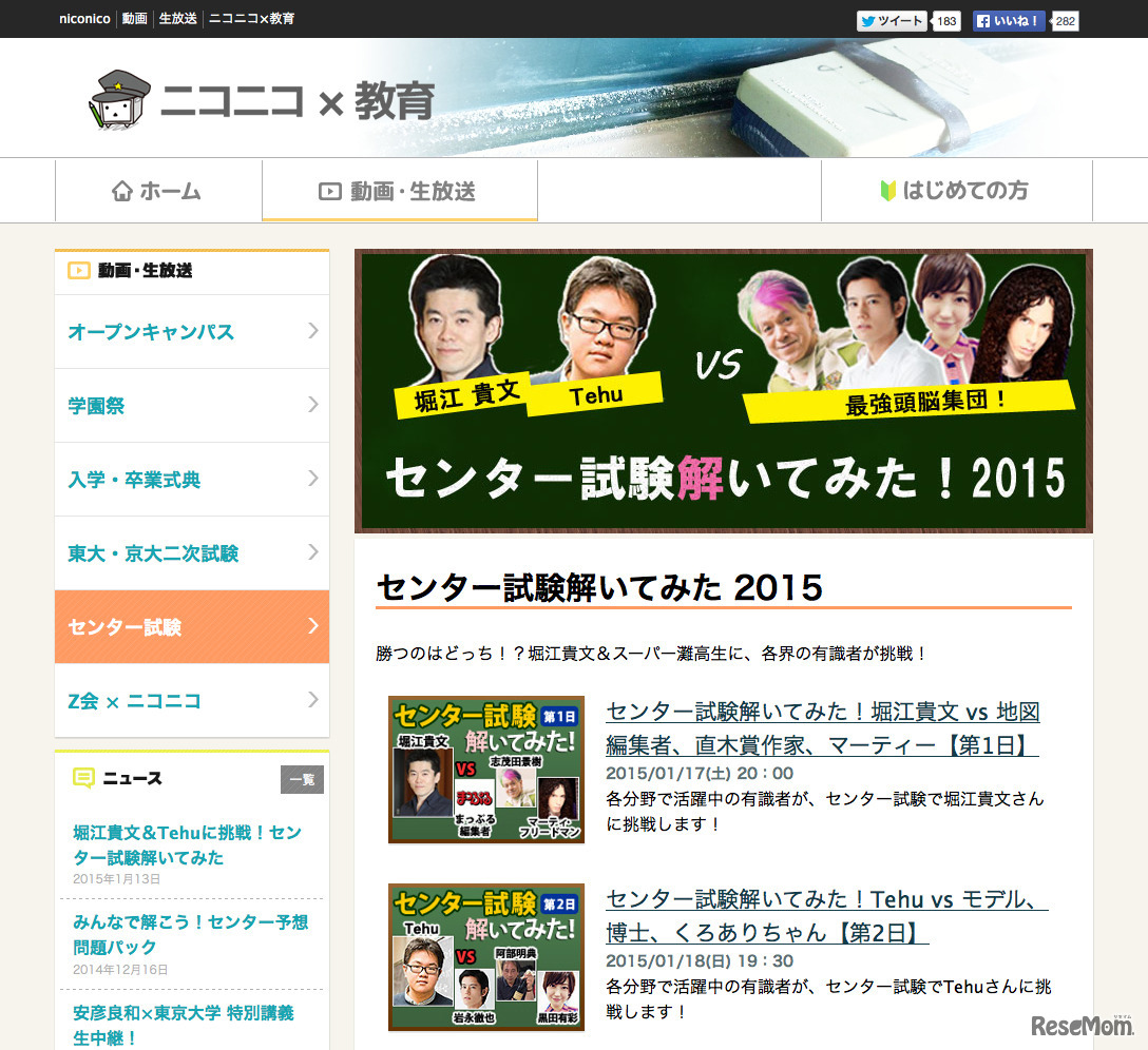 ニコニコ生放送は今年も、センター試験当日に、堀江貴文氏と灘高校出身の大学生Tehu氏に、各界の有識者が挑戦する「センター試験解いてみた 2015」を17日は20時より、18日は19時30分より放送する。