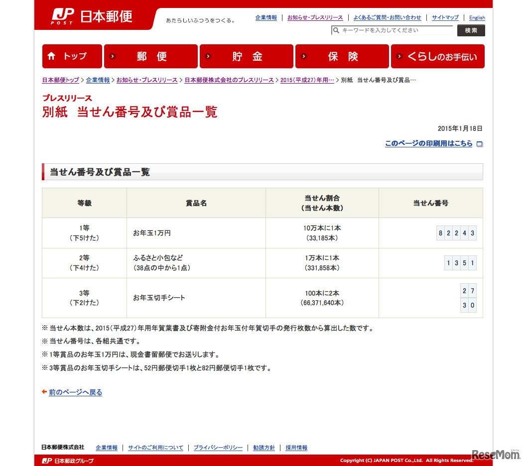 日本郵便は1月18日、千代田区丸の内のJPタワー ホール&カンファレンスにおいて「2015年用年賀 お年玉くじ抽選会」を開催した。引き換え期間は明日2015年1月19日から2015年7月21日まで。