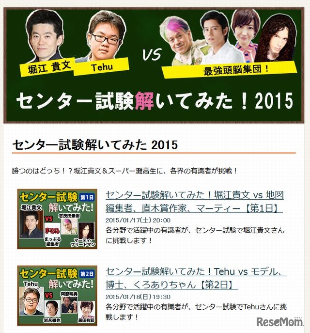 動画サービス「niconico」はセンター試験当日の1月17日と18日、有識者が大学入試センター試験に挑戦する番組「センター試験解いてみた」を放送。堀江貴文が英語と地理Bで8割正解、Tehuが数学IA、数学IIB、物理の3科目で満点をとるなど好成績を残した。