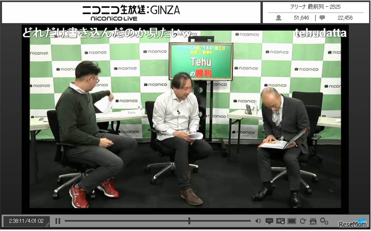 動画サービス「niconico」はセンター試験当日の1月17日と18日、有識者が大学入試センター試験に挑戦する番組「センター試験解いてみた」を放送。堀江貴文が英語と地理Bで8割正解、Tehuが数学IA、数学IIB、物理の3科目で満点をとるなど好成績を残した。