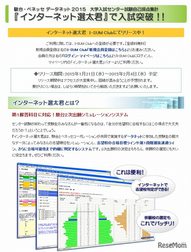 駿台予備学校とベネッセコーポレーションは1月21日、大学入試センター試験の自己採点集計シミュレーションシステム「インターネット選太君」の提供を開始した。リリース期間は、2月4日までの予定。駿台I-SUM Clubに登録(無料)すると、無料で利用することができる。