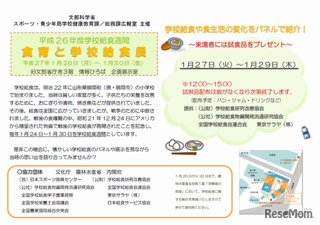 文部科学省は、全国学校給食週間(1月24日~30日)に合わせて1月26日から、「食育と学校給食展」と「学校給食フェア」を開催する。省内職員食堂などで学校給食を基にしたランチを提供するほか、学校給食食材の試供品配布、レプリカやパネル展示などを行う。