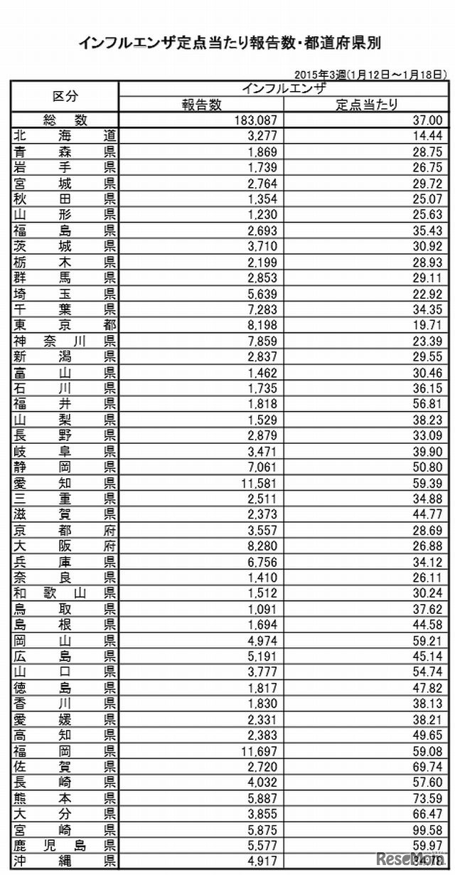 厚生労働省は1月23日、2015年第3週(1月12日から1月18日まで)のインフルエンザ発生状況を発表した。全国の保育所や幼稚園、小中高校で休校が37施設、学年閉鎖が678施設、学級閉鎖が2,214施設となった。