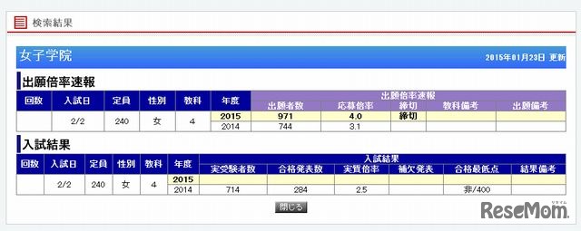 四谷大塚は1月24日、「出願倍率速報と入試結果」の最新情報を公表した。最終出願倍率は、桜蔭が2.7倍、女子学院が4.0倍、雙葉が5.2倍で、いずれの学校も前年より出願者数と出願倍率が増加した。