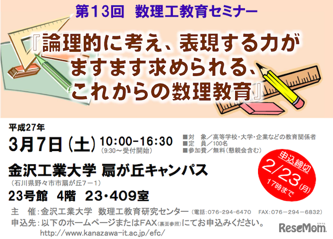 金沢工業大学数理工教育研究センターは、高校・大学・企業などの教育関係者を対象にした数理工セミナー「論理的に考え、表現する力がますます求められる、これからの数理教育」を3月7日(土)に開催する。参加費は無料。