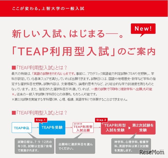 2015年度一般入試から外部英語試験であるTEAP(アカデミック英語能力判定試験)を導入した上智大学が1月29日、過去最高の志願者数を記録したと発表した。志願者数は、TEAP利用型一般入試が9,106人、学科別入試が2万2,634人、合計3万1,740人となった。