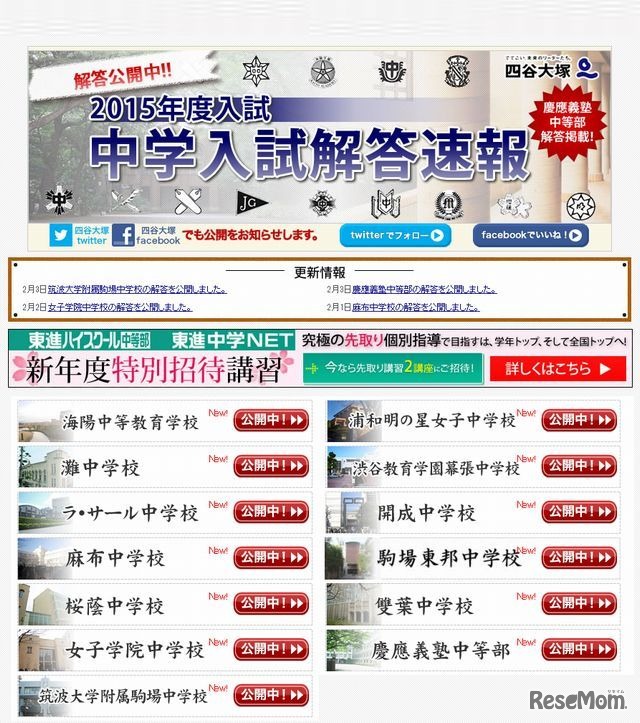 四谷大塚は特設Webページ「2015年度入試 中学入試解答速報」にて、2月3日入試の筑波大学附属駒場中学校と慶應義塾中等部の解答速報を公開した。出願倍率は筑波大学附属駒場が6.2倍、慶應義塾中等部が男子5.9倍、女子8.1倍。