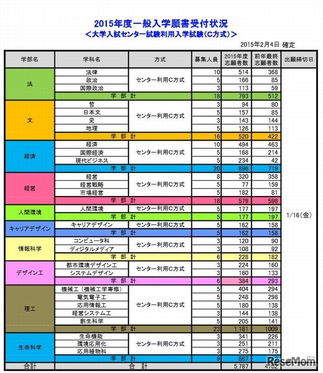 青山学院大学と法政大学は、大学入試センター試験利用入試の志願者数を確定した。平均出願倍率は、青山学院大学が58倍、法政大学が(B方式)39倍、(C方式)46倍。出願倍率が特に高い学部は、青山学院大学「教育人間科学部」108倍であった。