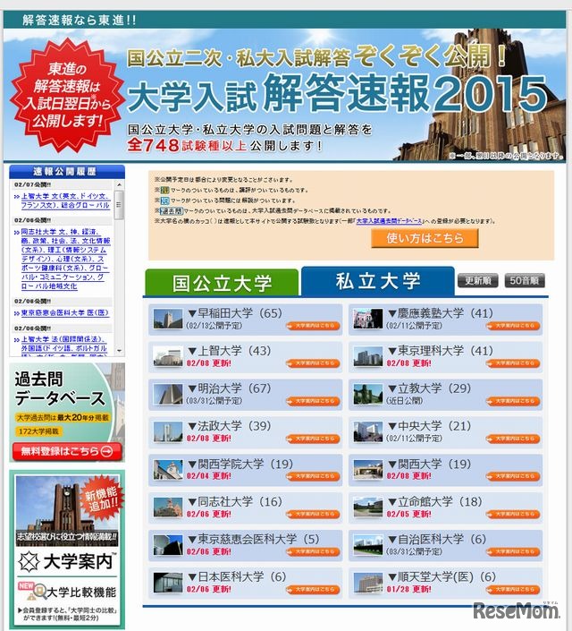 河合塾や駿台、東進、代々木ゼミナール、城南予備校、増田塾、武田塾の予備校では、大学入試の解答速報をWebサイトに掲載する。すでに上智大学や東京理科大学、法政大学、関関同立などの解答が順次公開されている。