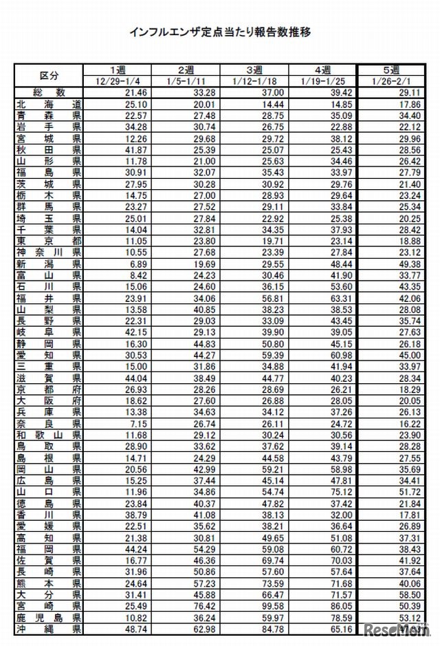 厚生労働省は2月6日、2015年第5週(1月26日~2月1日)のインフルエンザ発生状況を発表した。定点当たりの報告数は29.11で、前週の39.42から減少した。1週間の推計患者数も前週より57万人減の135万人となった。