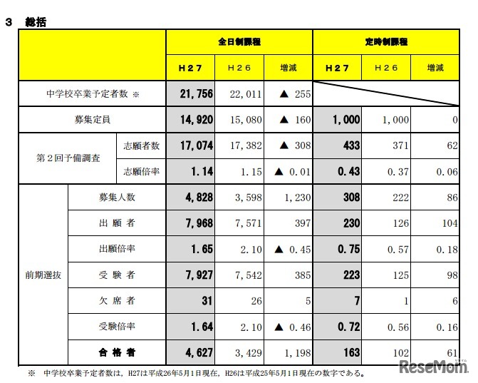 宮城県は2月10日、平成27年度宮城県公立高等学校入学選抜の前期選抜の合格状況を発表した。19時現在、合格者の受験番号を学校別に掲載している。全日制課程では、募集人数4,828人に対し7,968人が出願、7,927人が受験し4,627が合格した。