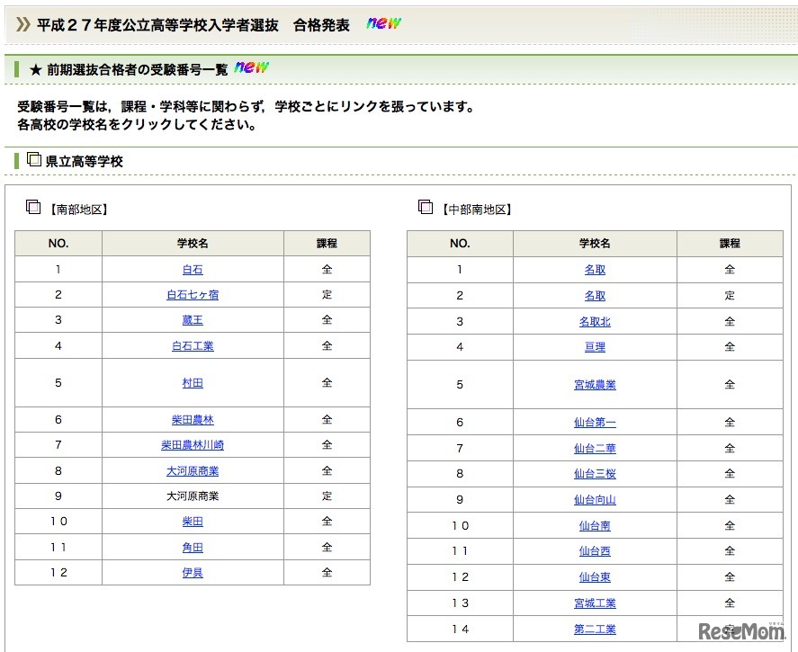 宮城県は2月10日、平成27年度宮城県公立高等学校入学選抜の前期選抜の合格状況を発表した。19時現在、合格者の受験番号を学校別に掲載している。全日制課程では、募集人数4,828人に対し7,968人が出願、7,927人が受験し4,627が合格した。