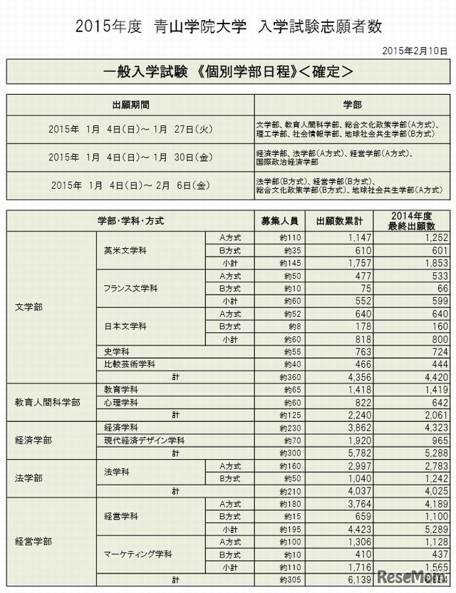 代々木ゼミナールは2月12日、私立大学の出願結果を公表した。各大学の入試方式ごとの募集人員と志願者数、志願倍率、志願者数の昨年比などが掲載されている。出願倍率は、慶應義塾大学が11.3倍、早稲田大学が18.5倍となった。