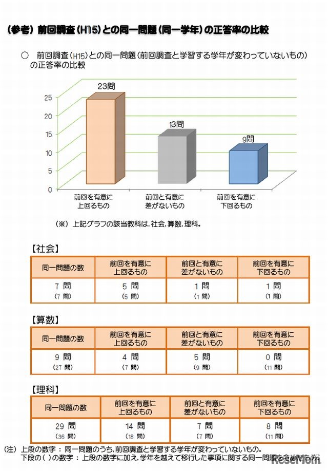 前回との同一問題の正答率の比較