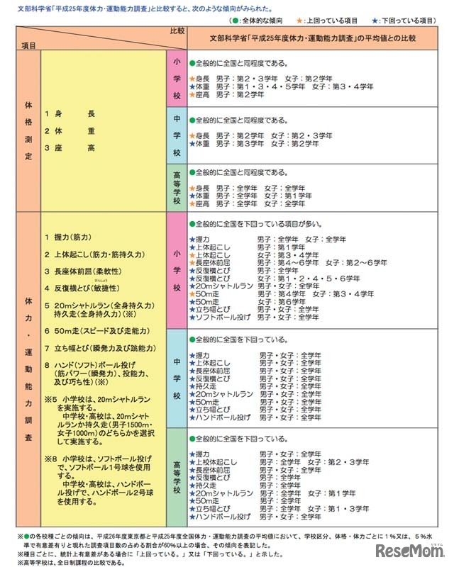 東京都教育委員会は2月12日、都内公立学校の全児童・生徒を対象とした「平成26年度東京都統一体力テスト」の結果を分析し公表した。体力テストの実技では、全般的に全国平均を下回る結果となり、特に中学校はその傾向が顕著だった。