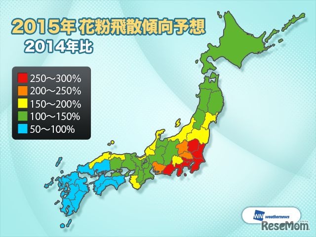 ウェザーニューズは2月13日、関東全域と東海・甲信・九州の一部で「花粉シーズン」に入ったと発表した。前年に比べると、関東地方では18日遅い花粉シーズン入り。スギ花粉の飛散量は、九州で3月上旬、関東~中国・四国では3月中旬がピークと予想されている。