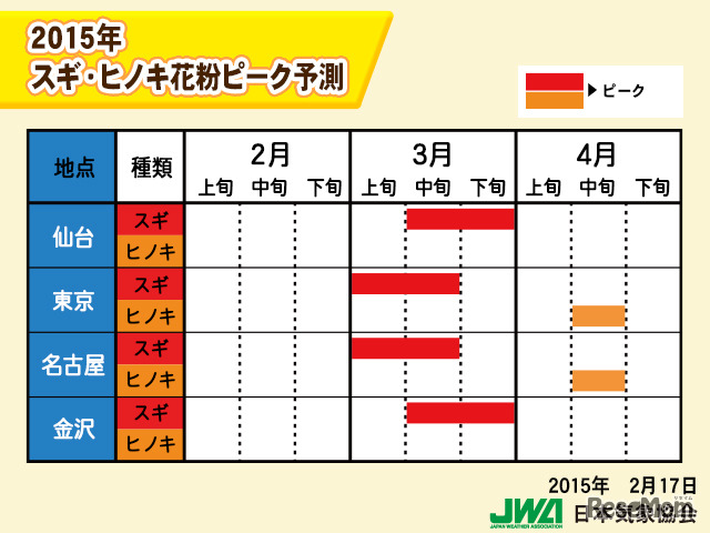 日本気象協会は、2月17日(火)に全国・都道府県別の2015年春の花粉(スギ・ヒノキ、北海道はシラカバ)飛散予測、第4報を発表。九州から関東地方の多くの地点で本格的な花粉シーズンに突入した。福岡では2月下旬から花粉のピークを迎えると予想されている。