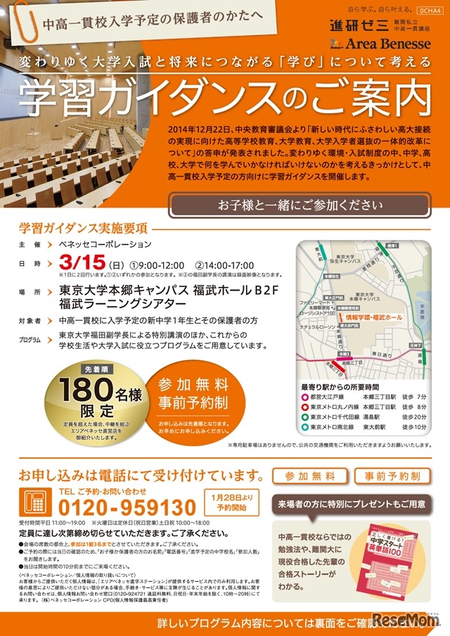ベネッセコーポレーションの「進研ゼミ 難関私立中高一貫講座」は、3月15日(日)に東京大学本郷キャンパスで中高一貫校入学予定の新中学1年生と保護者向け学習ガイダンスを開催する。