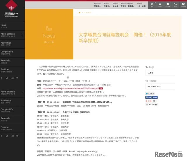 早稲田大学や慶應義塾など私立大学(学校法人)6校の「大学職員合同就職説明会」が、3月17日(火)に開催される。会場は早稲田大学早稲田キャンパス、事前予約不要・入退場自由。2016年4月入職の新卒採用に関わる説明内容となっている。