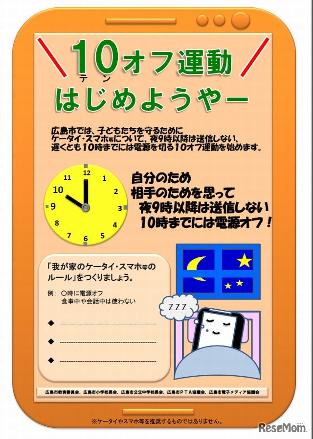 広島市は市内の小中学校とPTA、教育委員会が一体となって、携帯電話やスマートフォンを午後9時以降は送信しない、遅くても午後10時までには電源を切る「10(テン)オフ運動」の取組みを開始した。適切な使用方法で規則正しい生活習慣の定着を図る。