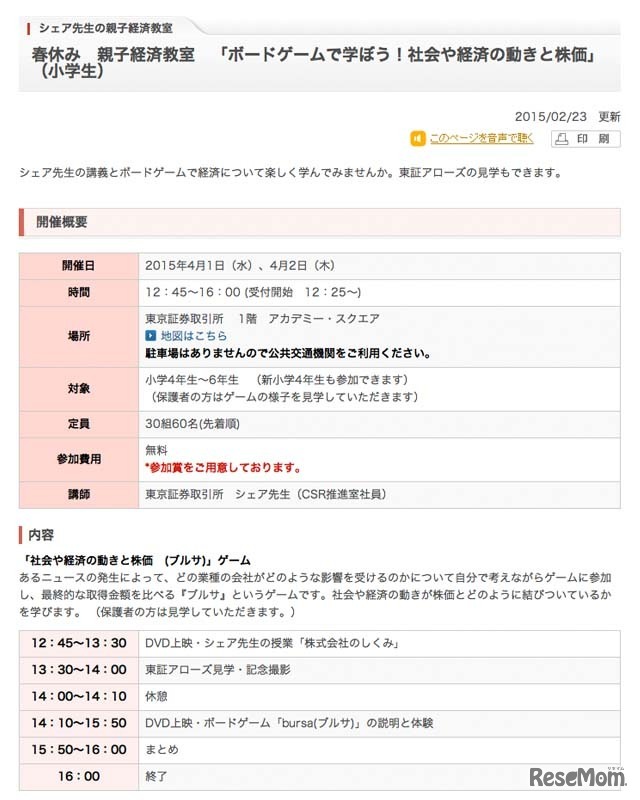 東京証券取引所では3月25日から4月3日の春休み期間、「シェア先生の親子経済教室」を開催する。小学4年生から中学3年生までの子どもとその保護者を対象に、東証日銀見学会とボードゲーム大会を実施。申込みは3月10日9時から(先着順)。