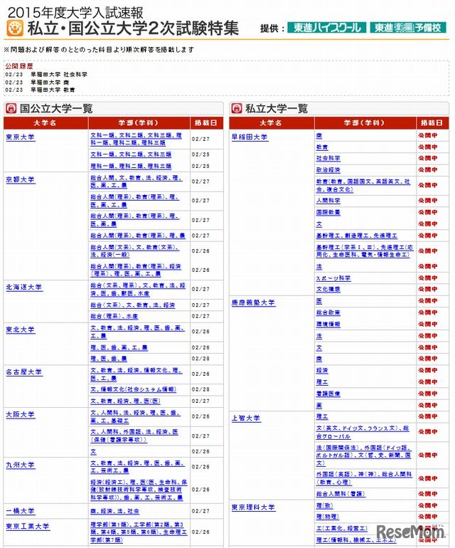 国公立大学の2次試験が2月25日(水)より開始する。前期日程は、161大学542学部で実施され、募集人員80,144人に対し、258,870人が志願。志願倍率は3.2倍となった。予備校などでは、試験当日より解答速報を行う。