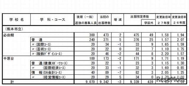熊本県教育委員会は2月24日、公立高校入学者選抜の後期選抜(一般選抜)の出願変更後の状況を発表した。全日制の出願倍率は1.03倍で、前年度の1.04倍と比べ0.01ポイント減少した。出願倍率がもっとも高いのは、熊本工業(建築)2.4倍であった。