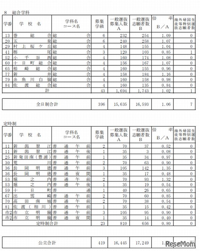 新潟県教育委員会は3月2日、公立高校一般選抜の出願変更後の出願状況を発表した。全日制の出願倍率は1.06倍で、出願倍率がもっとも高いのは、新潟中央(食物)2.0倍であった。