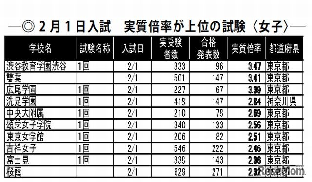 実質倍率が上位の試験(2月1日女子)