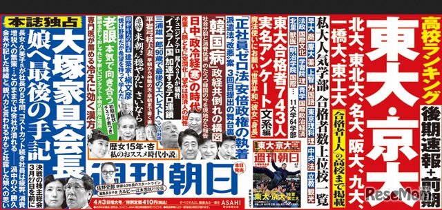 3月31日発売のサンデー毎日と週刊朝日は、全国2,300校以上の高校における東大、京大、早稲田大、慶應義塾大など有名大学合格者数を特集している。定価はどちらも410円(税込)。