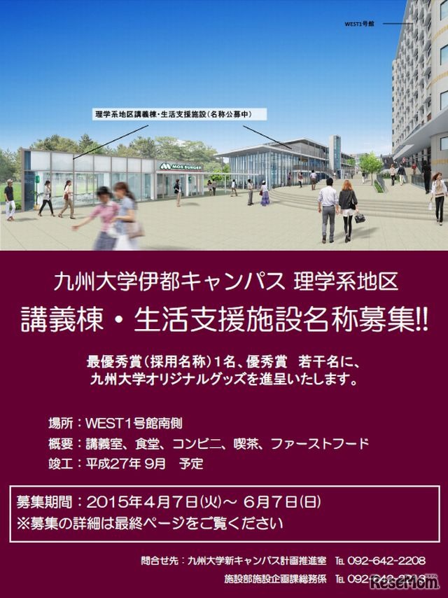 九州大学は、伊都キャンパスの施設の名称について、広く一般から募集している。「理学系地区講義棟・生活支援施設」と「センターゾーン福利厚生施設」の2施設。募集期間は6月7日まで。命名理由を添えて、FAXかメールで応募する。
