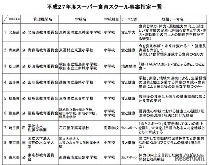 文部科学省は4月14日、平成27年度スーパー食育スクール指定校を決定したと発表した。決定されたのは、お茶の水女子大学附属小学校や武雄市立若木小学校、花咲徳栄高等学校、など全国35校、30事業が決定した。指定期間は1年間。
