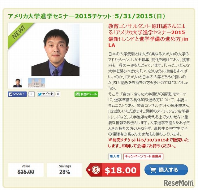 教育コンサルタントの原田誠氏による「アメリカ大学進学セミナー2015 最新トレンドと進学準備の進め方」が5月31日にアメリカ・ロサンゼルスで開催される。受講料は前売り券が18ドル。アメリカの大学進学を目指すうえで欠かせない重要な情報を伝える。