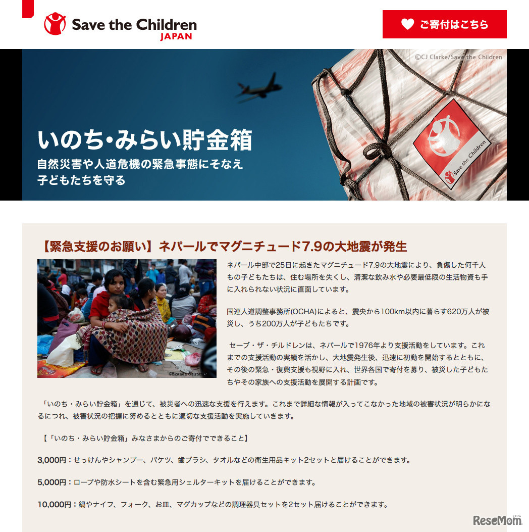 4月25日午前11時56分に発生したネパール大規模地震では、深刻な被害が発生しており、多くの人が支援を必要としている。ネパールの全人口のおよそ半数が18歳未満の子どもで、深刻な被害と子どもたちへの影響が心配されているという。