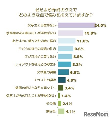 保育士求人情報サイト「保育のお仕事」の行ったアンケートでは、保育士の90%が保護者に向けた「おたより」の作成に悩みを抱えていることがわかった。同サイトでは悩み別に作成のコツを紹介している。