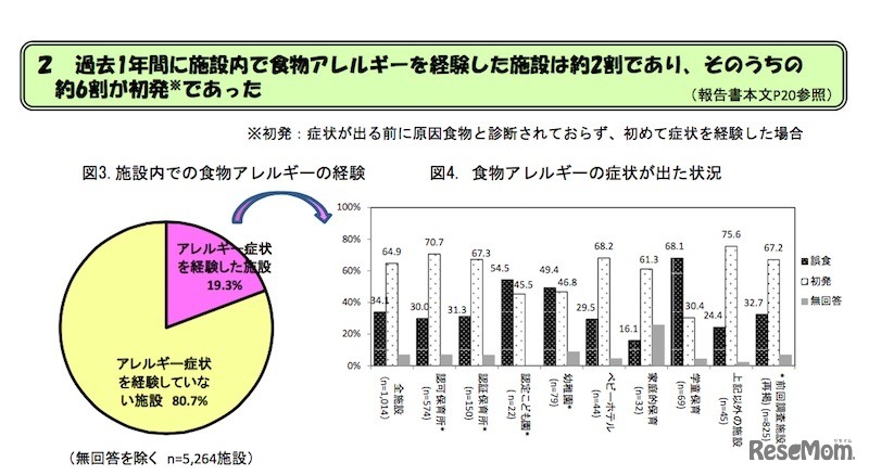 8割以上の保育施設で「食物アレルギー」のある園児・児童が在籍していることが、東京都が行ったアレルギー疾患のある子どもに関する調査でわかった。また、施設内で食物アレルギー症状が出た状況では、「初発」がもっとも多い。