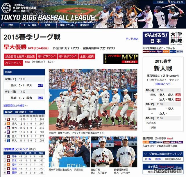 東京六大学野球の春季リーグ戦全日程が5月31日に終了し、前日に優勝を決めた早稲田大学が13季ぶりの完全優勝を果たした。2位以下は、法大、慶大、明大、立大、東大が続いた。今季は早慶戦のポスターも話題となっている。