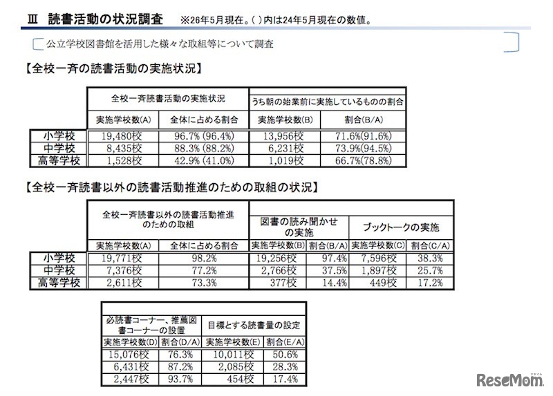 公立小学校の96.7%、中学校の88.3%が、全校一斉の読書活動を実施していることが、文部科学省が行った「学校図書館の現状に関する調査」からわかった。小学校の蔵書冊数は1億7,402万冊にのぼり、6割の小学校が図書標準にもとづく蔵書冊数を達成していた。