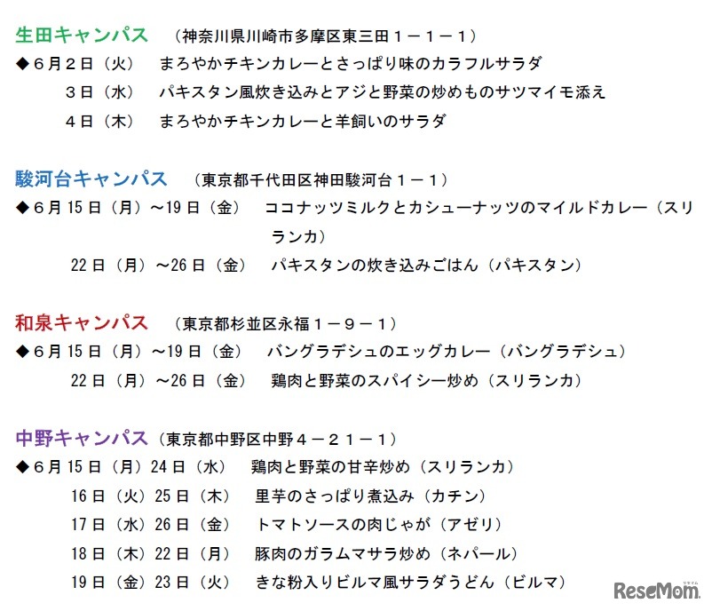 明治大学は、難民のふるさとの味を学食で提供する「Meal for Refugees」を今年も開催している。生田キャンパスではすでに終了しているが、駿河台・和泉・中野キャンパスともに6月15日から。数量限定で、売切れ次第終了となる。