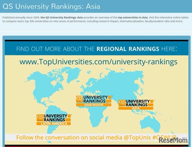 世界大学評価機関のQuacquarelli Symonds(QS)は、大学ランキング「アジア2015」を発表した。1位はシンガポール国立大学、2位は香港大学。日本の最高順位は東京大学で12位とアジアトップ10から初めて外れた。しかし、アカデミック評価指標では1位となった。