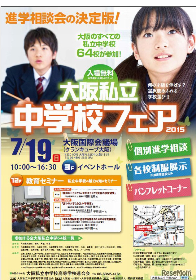 大阪府の私立中学校全64校が参加する「大阪私立中学校フェア2015」を7月19日、大阪国際会議場で開催する。個別進学相談や進学塾講師による教育セミナーなどが行われる。入場は無料。