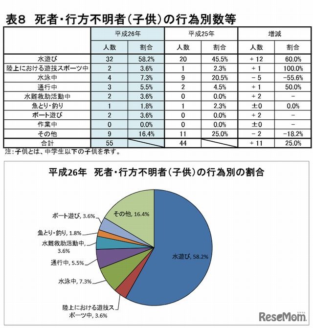 警察庁は6月18日、平成26年中における水難の概況を発表。全国の発生件数1,305件のうち、中学生以下の発生件数は166件。死者・行方不明者は55人と、前年より11人増となった。発生した場所では「河川」が半数以上を占めている。