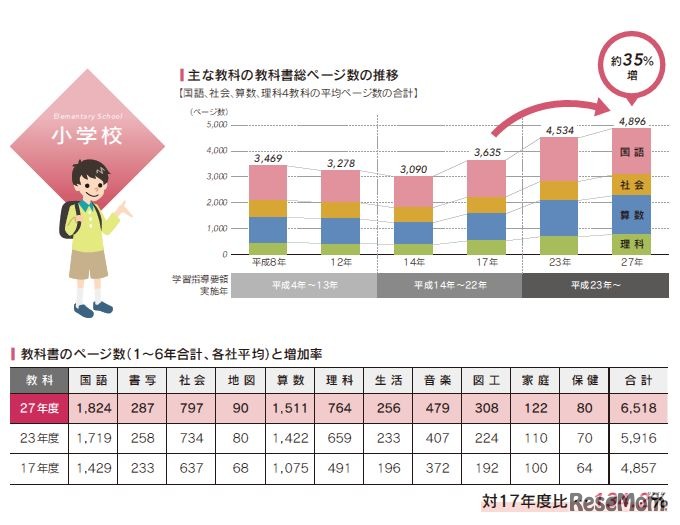 小中高校の教科書のページ数は、過去最大の増加率となっていることが、教科書協会が7月に発行した「教科書発行の現状と課題(平成27年度版)」より明らかになった。学力向上を図るため、小中学校では全教科の平均で約3割以上増えている。