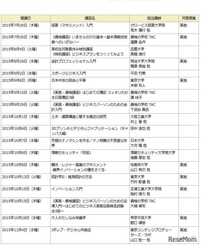 主な開講中・募集中の講座一覧(8月17日時点)