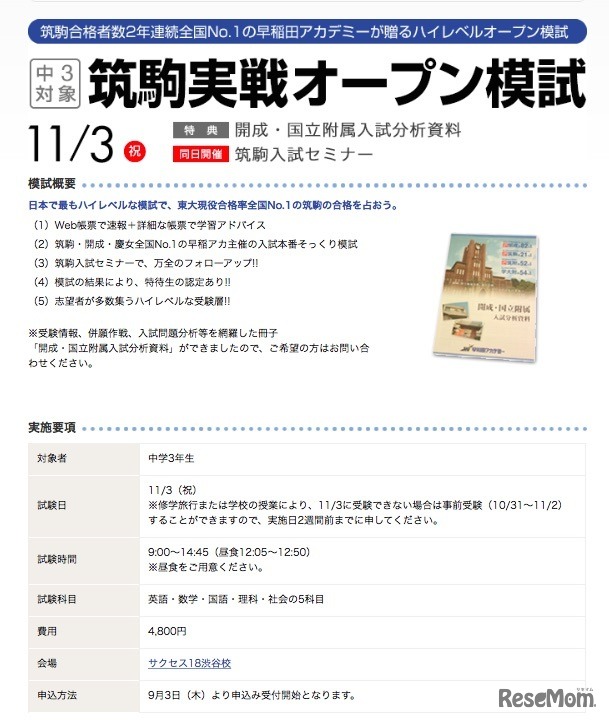 早稲田アカデミーは10月から11月にかけて、中学3年生対象の実戦オープン模試を開催する。10月18日には早慶実戦オープン模試、11月3日には筑駒実戦オープン模試を実施。いずれも参加費は4,800円。