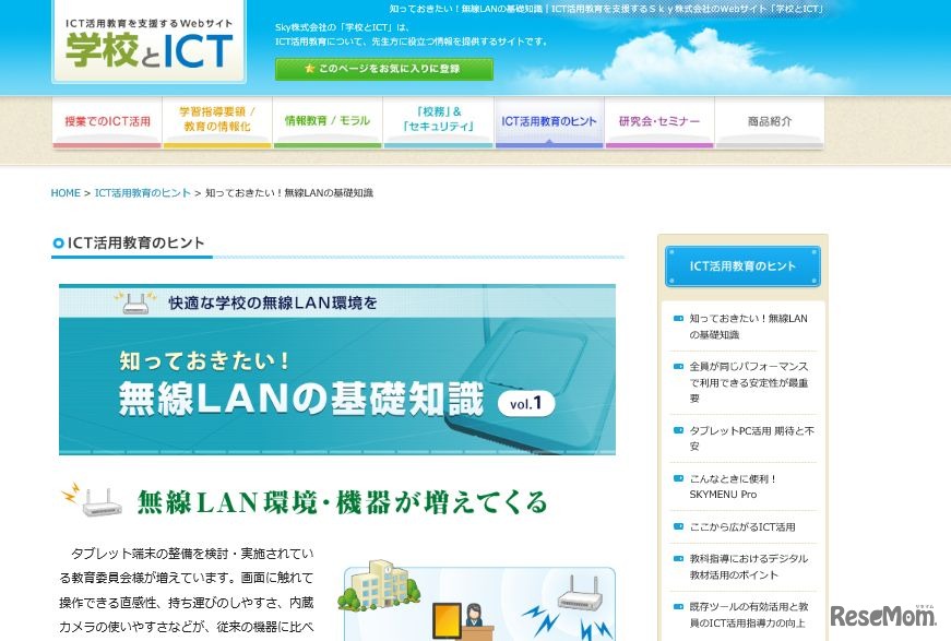 Skyが運営するICT活用教育支援サイト「学校とICT」は9月11日、学校無線LAN環境の基礎知識についての特集を公開した。タブレット端末に必要な通信環境の整備を解説している。
